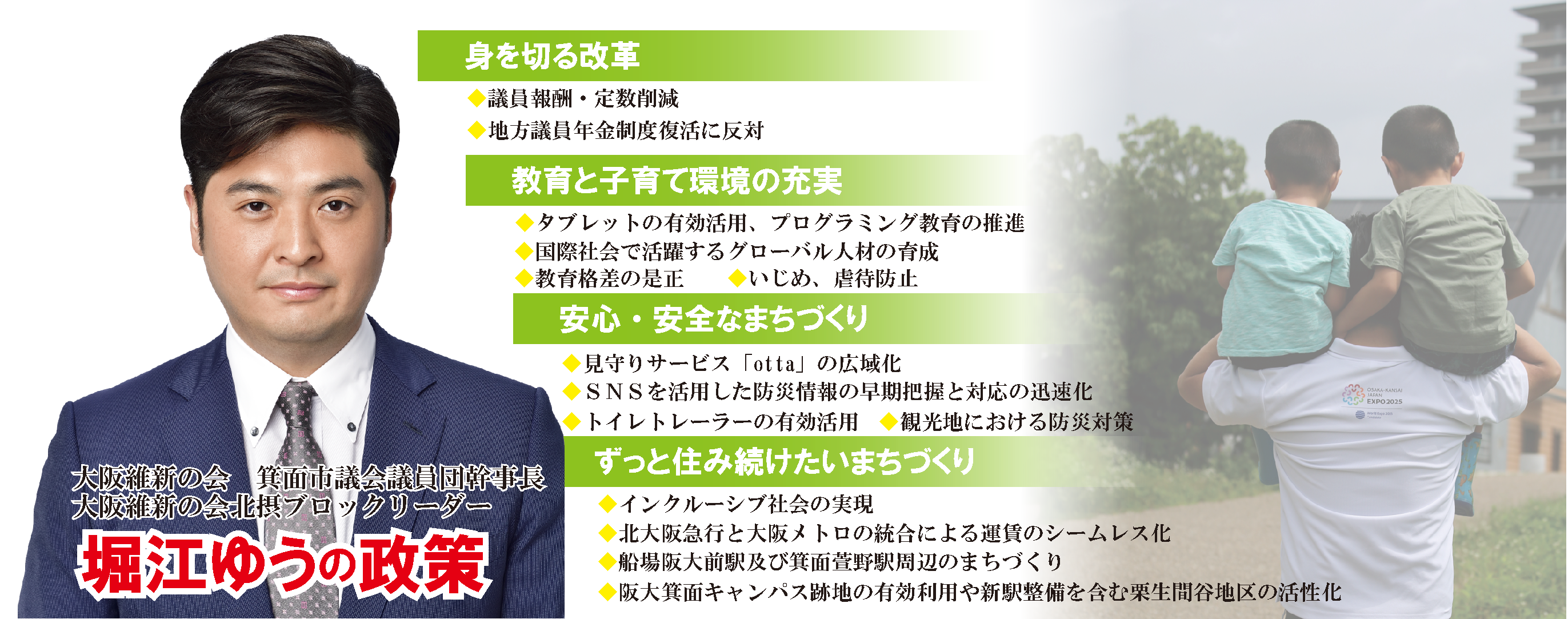 これからは、箕面市議会議員及び箕面市豊能郡の府政対策委員として箕面市のみならず豊能町や能勢町の課題にも目を向け、地域の皆様と一緒になり、安心、安全で持続可能なまちづくりを進めるための取り組みや改革を全力で推し進めていくため、心新たに頑張ってまいります。